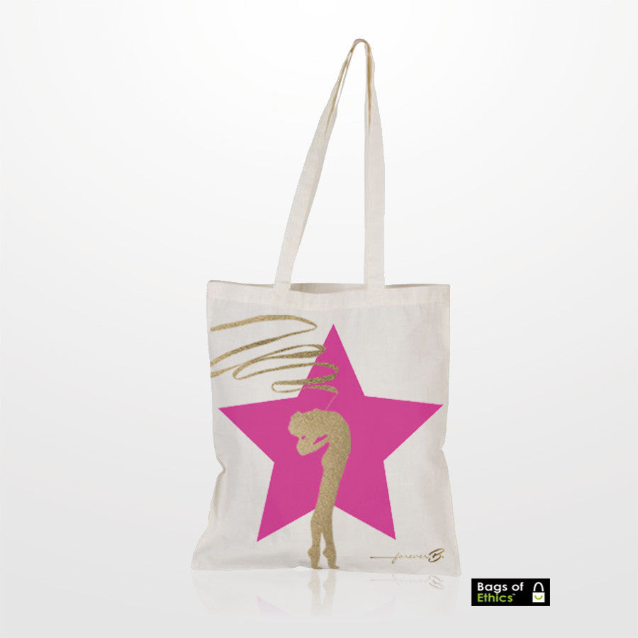 Gymnastic is beautiful! Express your passion for it! This beige tote bag features a golden gymnast with her ribbon in front of a large pink star