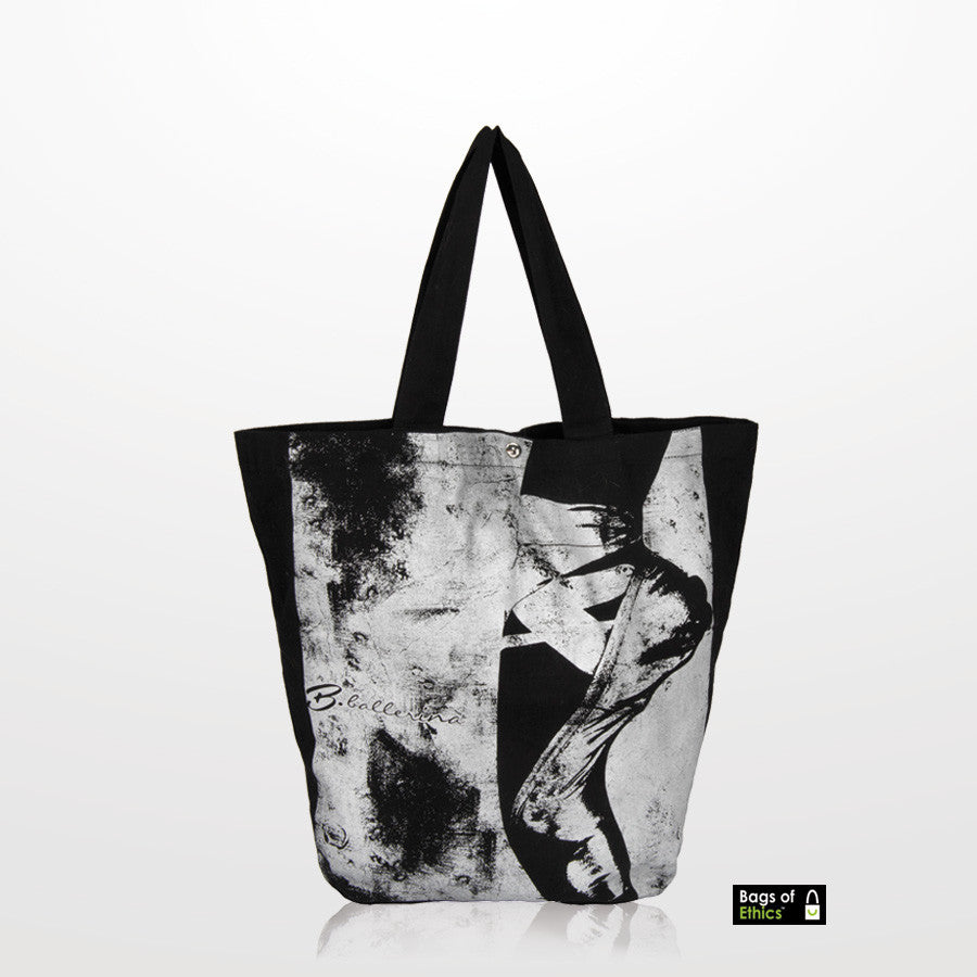 Whether it's your pointe shoes, your clothes, your notebooks or your phone, this large shopper is perfect to carry around eveything you love! This black bag features a large print of a pointe shoe on the front, a double handle and is secured by a snap button.