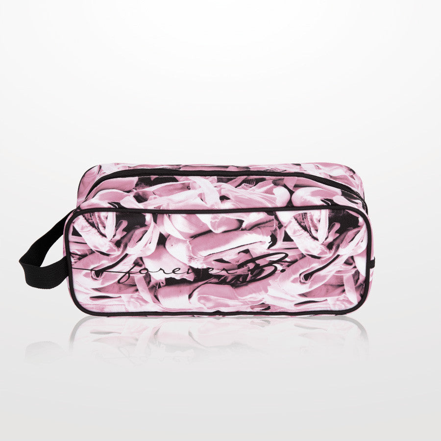 Take good care of your pointes with a garment bag designed for them! This pointe shoe bag is covered all over with bright pink pointe shoes and had a single black handle