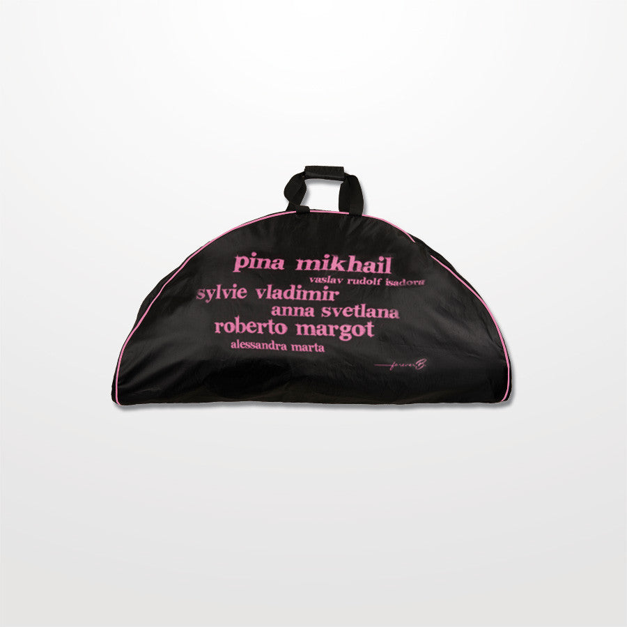 Take your tutus everywhere with you with this black tutu bag that features names of famous ballet dancers printed in pink on one side and has a double handle