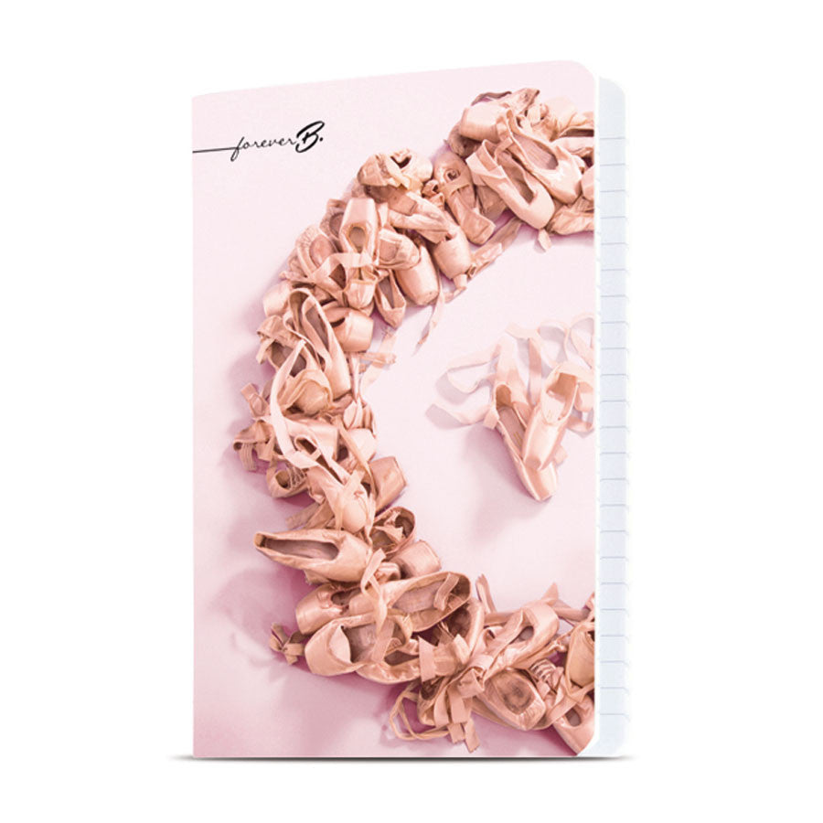 Never forget about all your dreams on pointes, write them all down on this notebook. The pink cover features a photo of many pointes shoes arranged in a semi circle