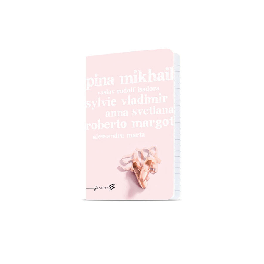 Show your passion with this tribute notebook. The pink cover features the names of famous ballet dancers written in white above a pair a pointe shoes.